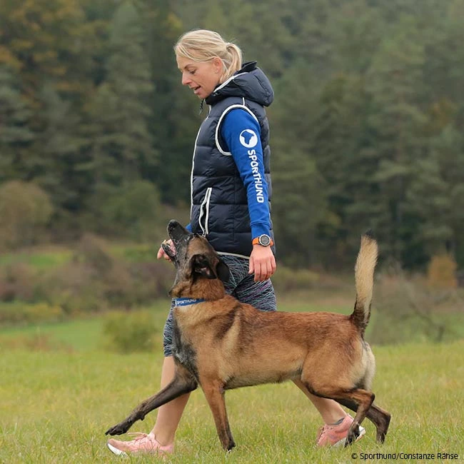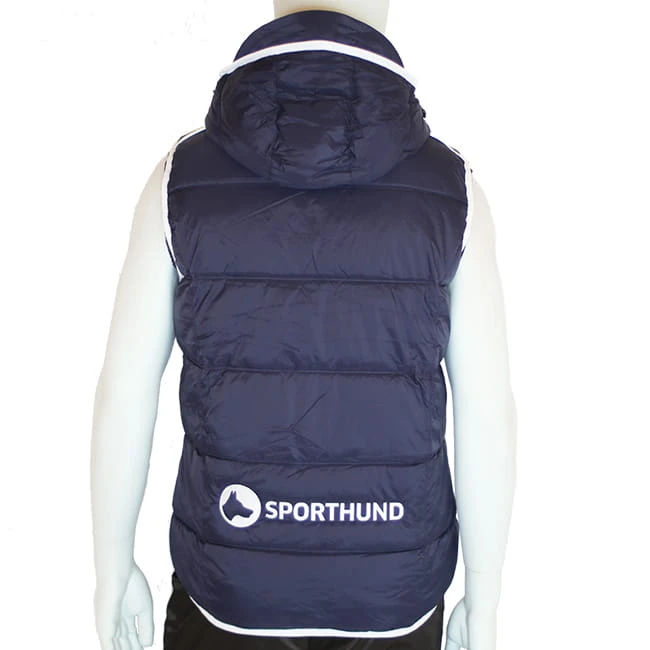 Die Maritime Weste mit Stick Sporthund ist eine modische Steppweste mit angeschnittener Kapuze.