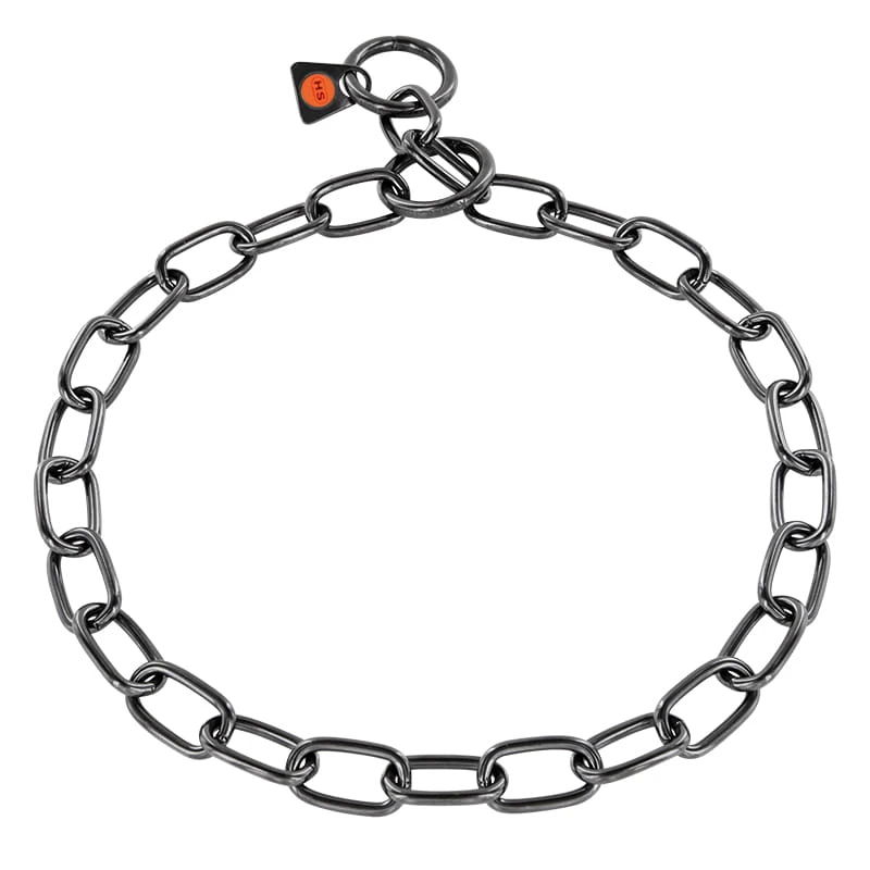 Die Edelstahlketten werden mit einem chemischen Prozess brüniert. Sie erhalten dadurch eine edle, dunkle Farbe. Auf den schwarzen (brünierten) Edelstahl-Ketten können produktionsbedingt Farbrückstände bleiben. Daher ist diese schöne Qualität nicht für weiße oder sehr helle Hunde geeignet. Zudem kann durch die permanente Reibung am Fell des Hundes ein Antik-Look der Kette entstehen.