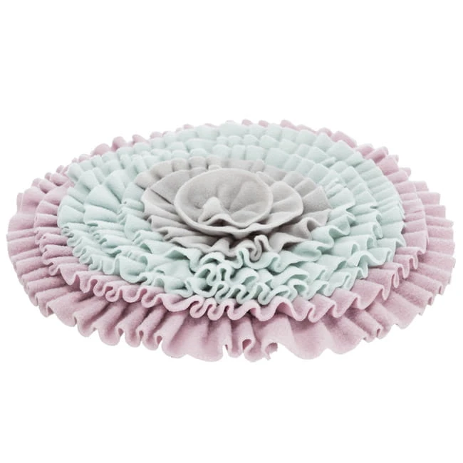 Im Welpen-Schnüffelteppich kannst du das Trockenfutter in den Zwischenräumen „verstecken“. Der Welpe darf die Decke dann erforschen und sich seine Belohnungen erschnüffeln. Ein tolles Nasentraining!